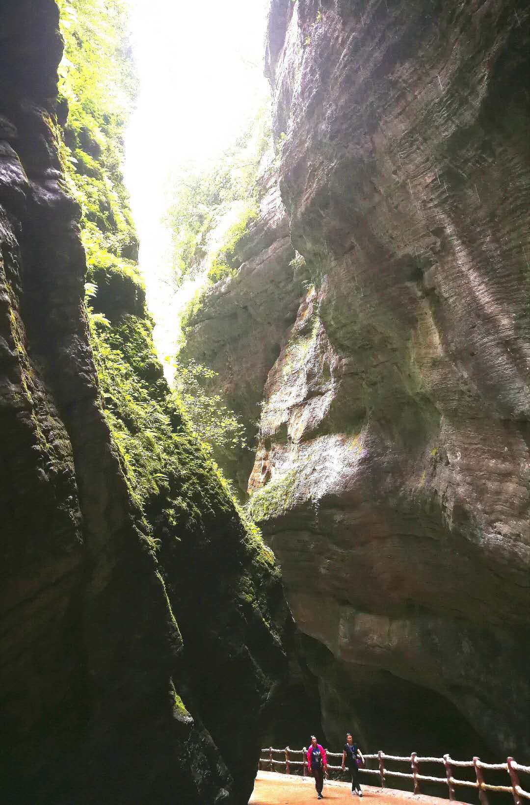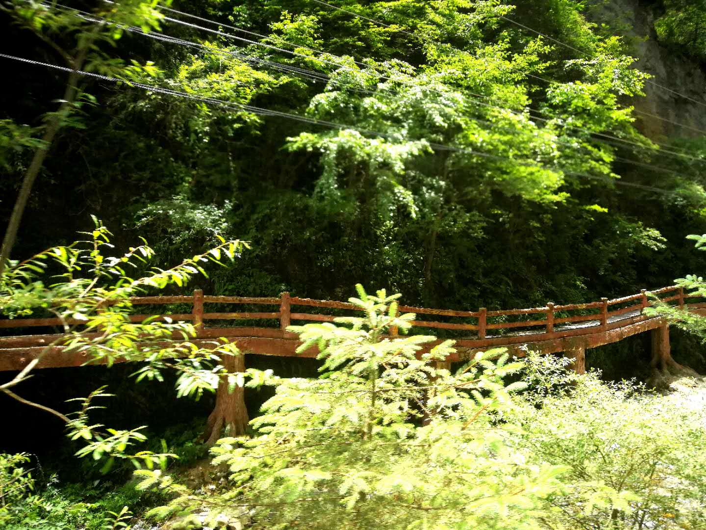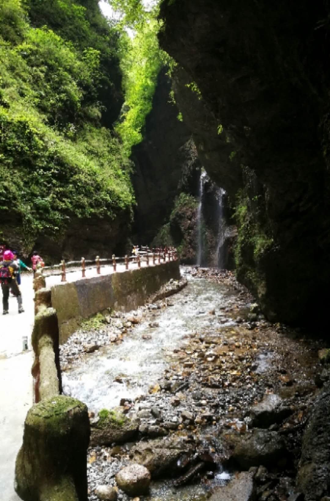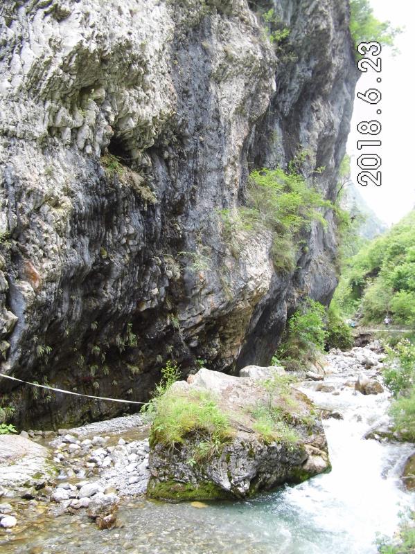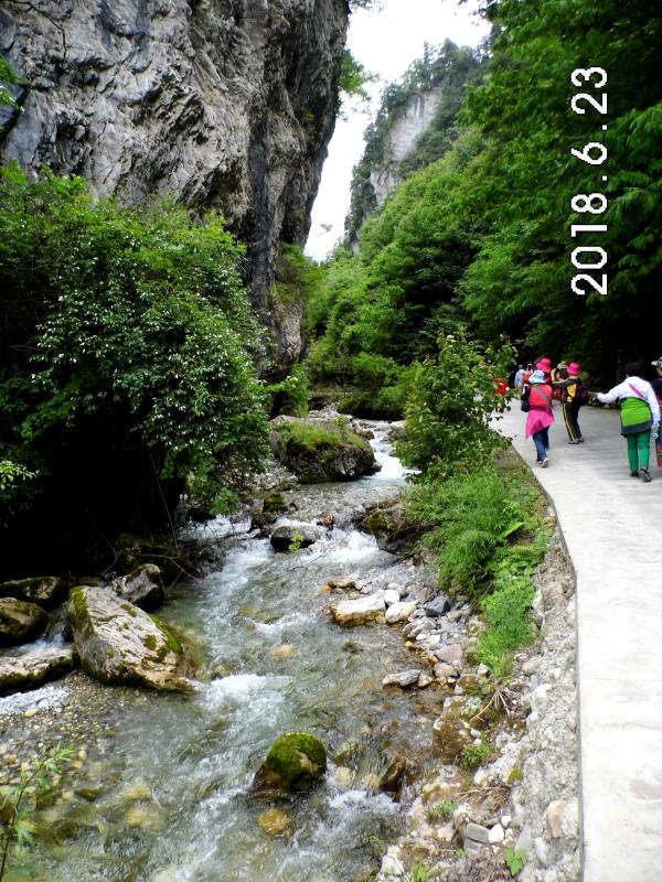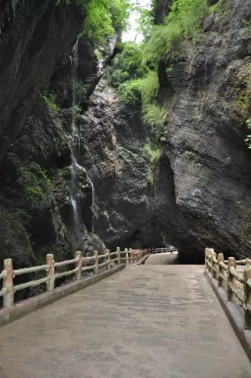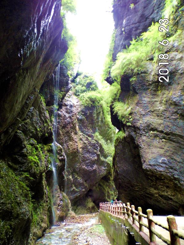 峡谷中怪石嶙峋,并有潺潺流水萦绕其间。间或出现的特色小桥,悬崖峭壁下长长的木栈道,不时闪入我们眼帘。峡中植物景观、地质景观、气象景观、水体景观,尽览眼底。