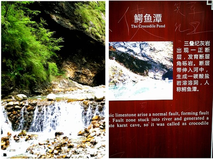 由于泥石流、塌方等破坏性影响,我们见到河道一侧的水里有许多跌落的山石,新开发的景区虽然景色很美,但完善建设也必须跟上。