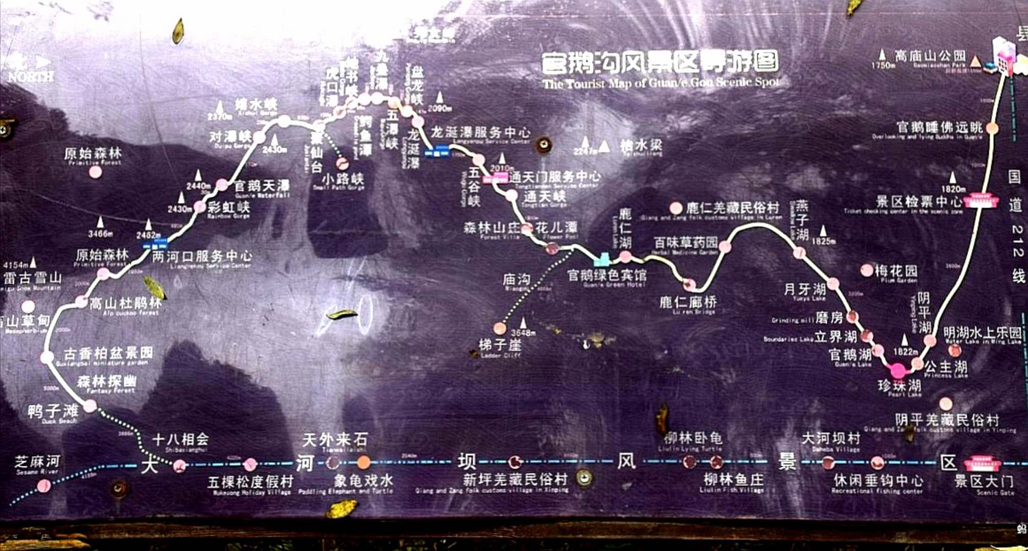 官鹅沟与鹅嫚沟为主的园区很大,官鵝沟有30多公里,前景区14公里为15个大小湖泊及十余个小瀑布;后主景区18公里为险峻峡谷、茂密原始森林,终点是雷古雪山及其相伴的高山草甸。紧看也得一天时间,我们计划乘车到通天门,再走到官鵝天瀑返回。