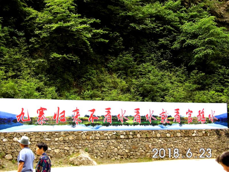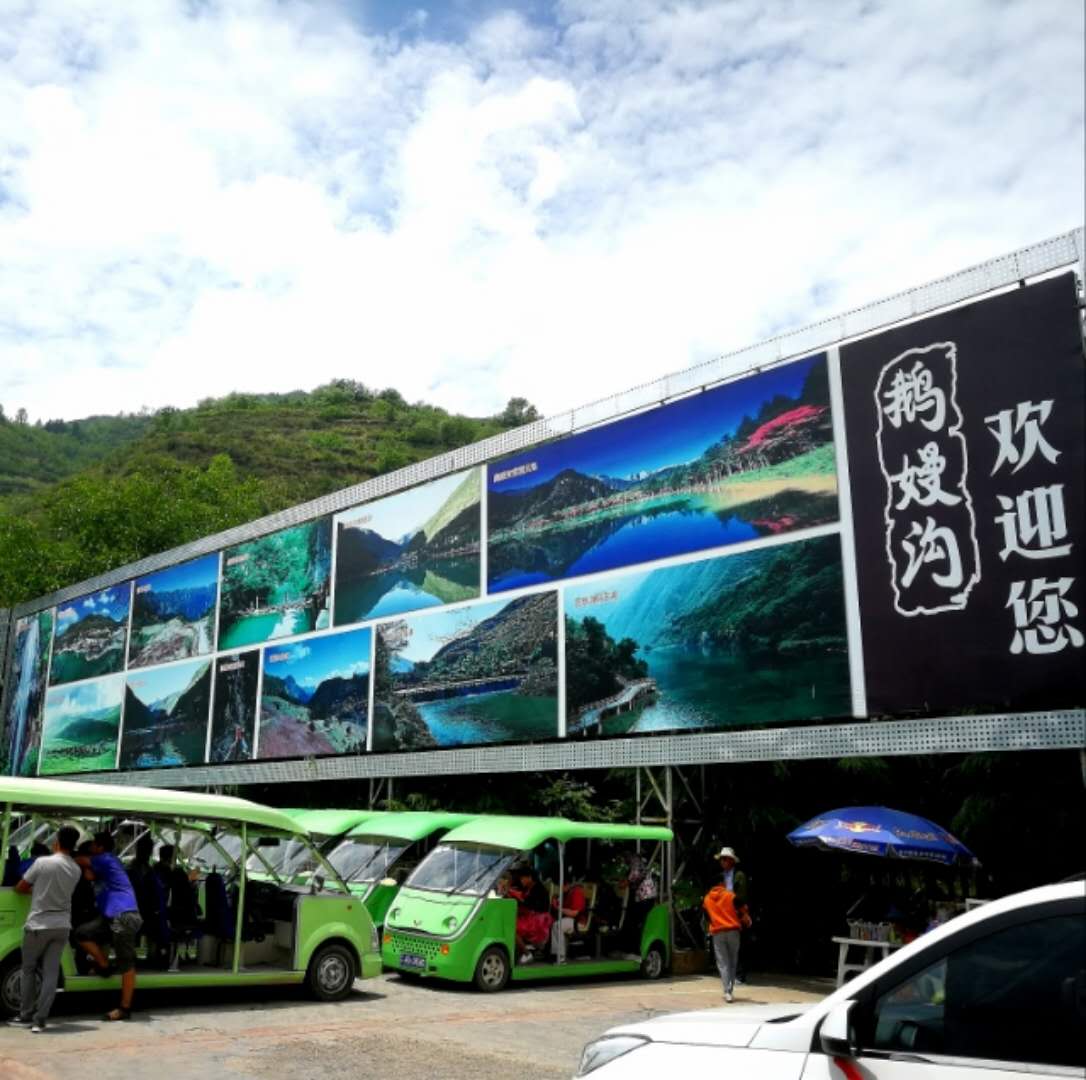 停车场里竖有官鵝沟、鵝嫚沟的大幅绝美图片,有著名诗人写到:”官鵝九寨,燕瘦环肥,两美竞妍,东方奇绝”。