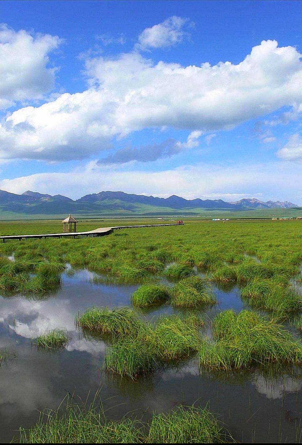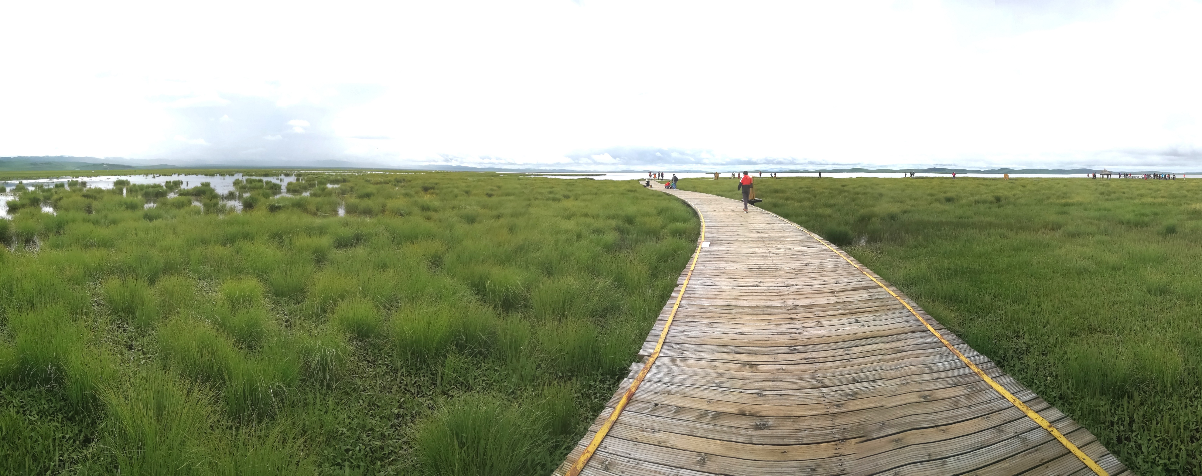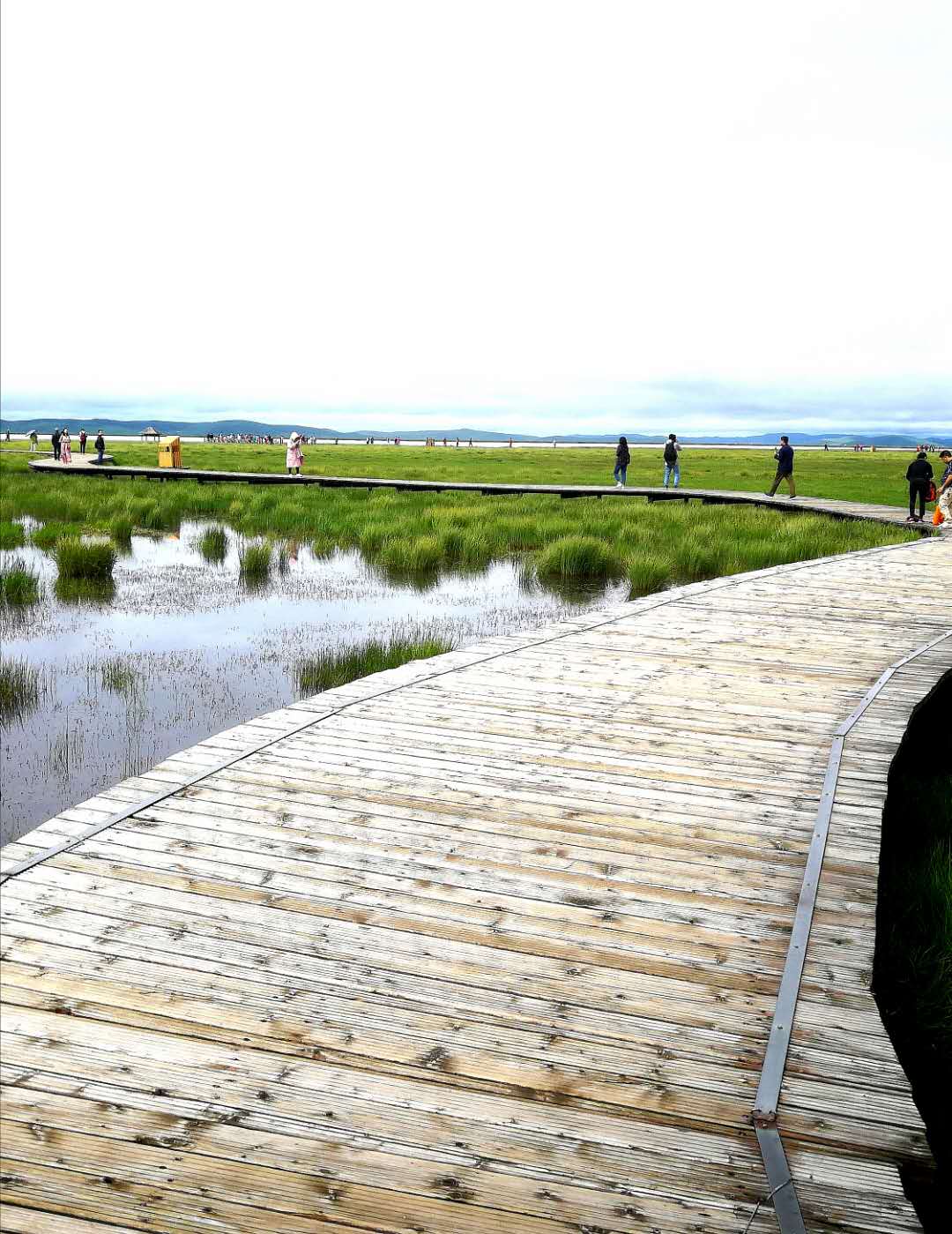 走在长长的木栈道上,观广阔无垠的热尔大草原,看湖底清洌的湖水中会开满姿意生长的白色花朵,绿草和鲜花一直长到天边。