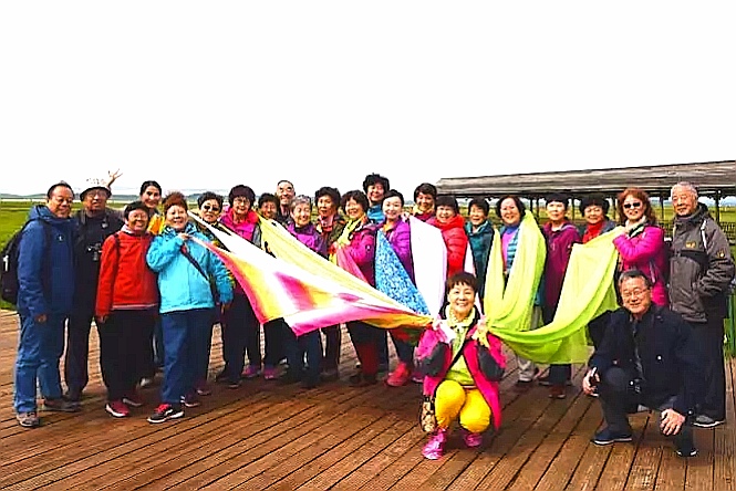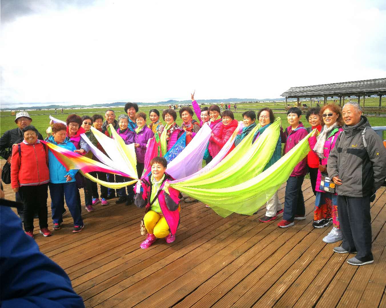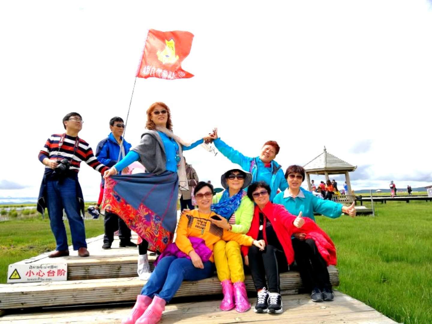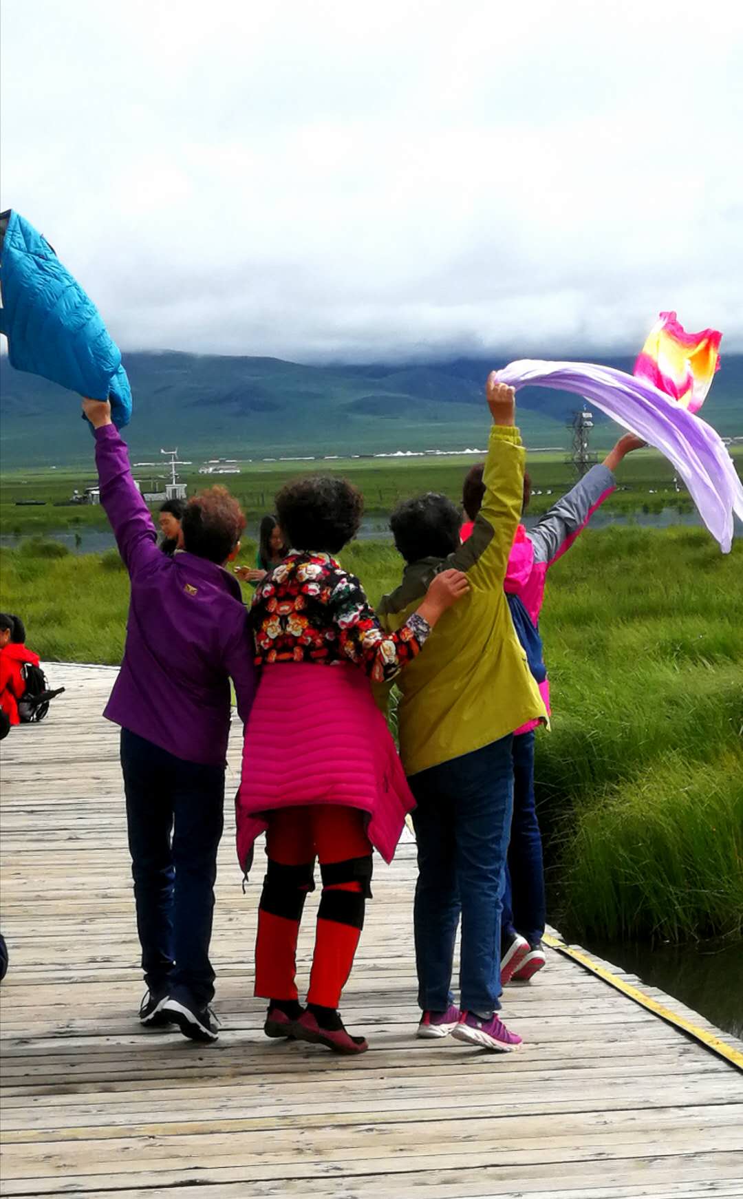 到了湿地游客中心,高兴的女战友们真浪漫,竟用绿色的紗巾,扎起了藏族的祈福形式 ————经幡!博得了周围游客的一阵欢呼!