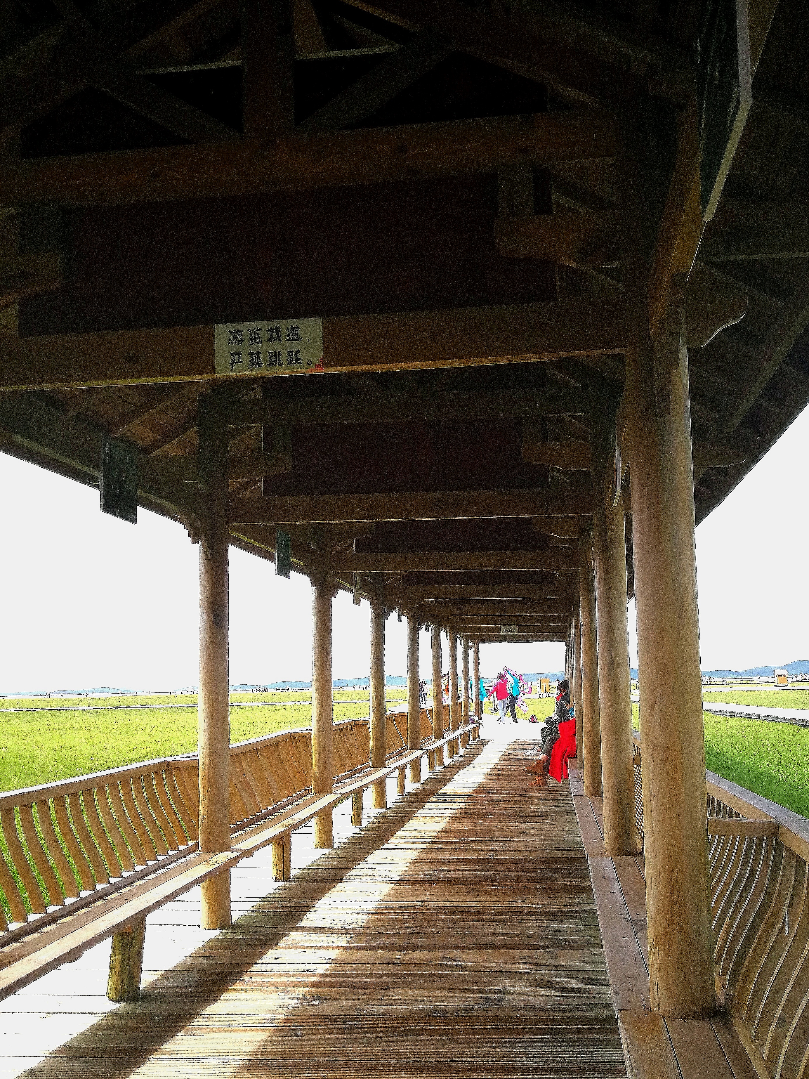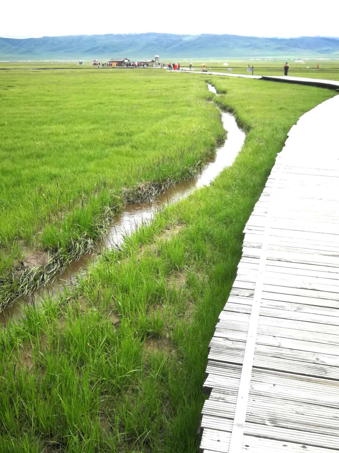 长长的木栈道在草原上铺成一个大大的“中”字。