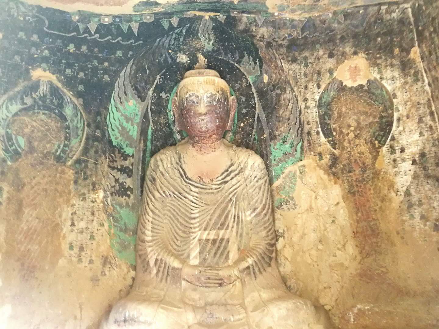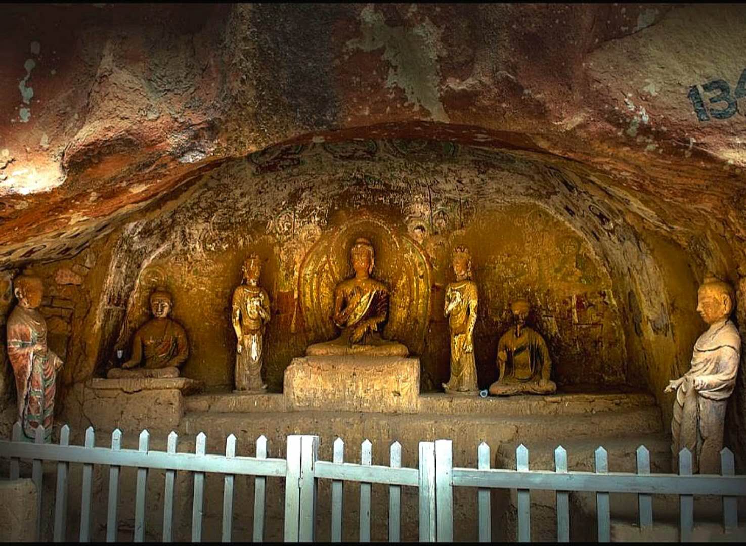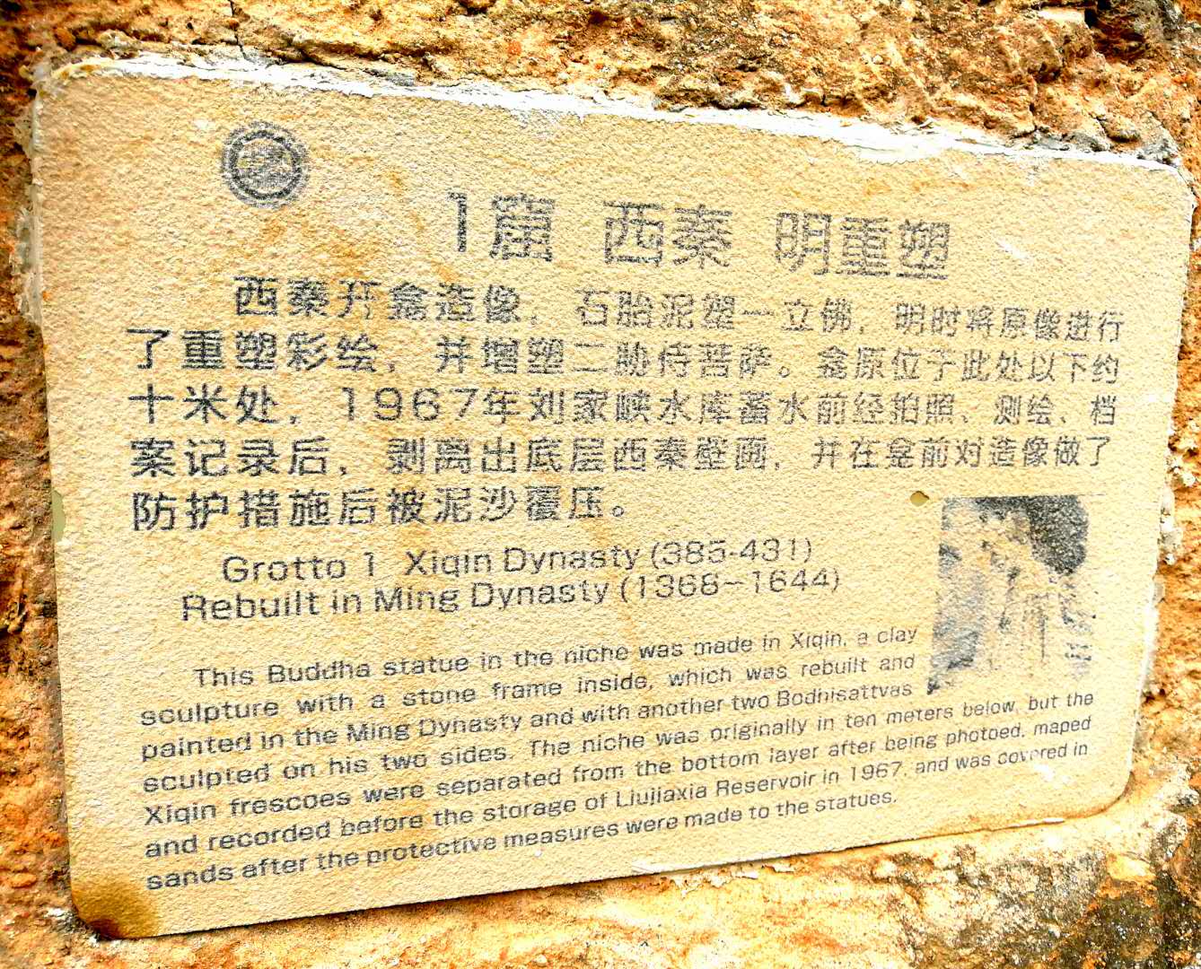 这是第一号石窟佛像,该窟中有西秦建弘元年(公元420年)名僧法显的墨书题记,是国内石窟中保留最早的纪年题纪,对全国其他古老石窟的断代提供了标识,具有十分重要的历史价值。