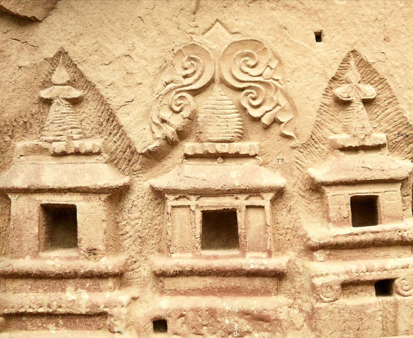 这个石窟里祥云缠绕,塔尖高耸。浮雕画————三座单层石塔。我感到与我们济南北魏时期的四们塔很相似呀!