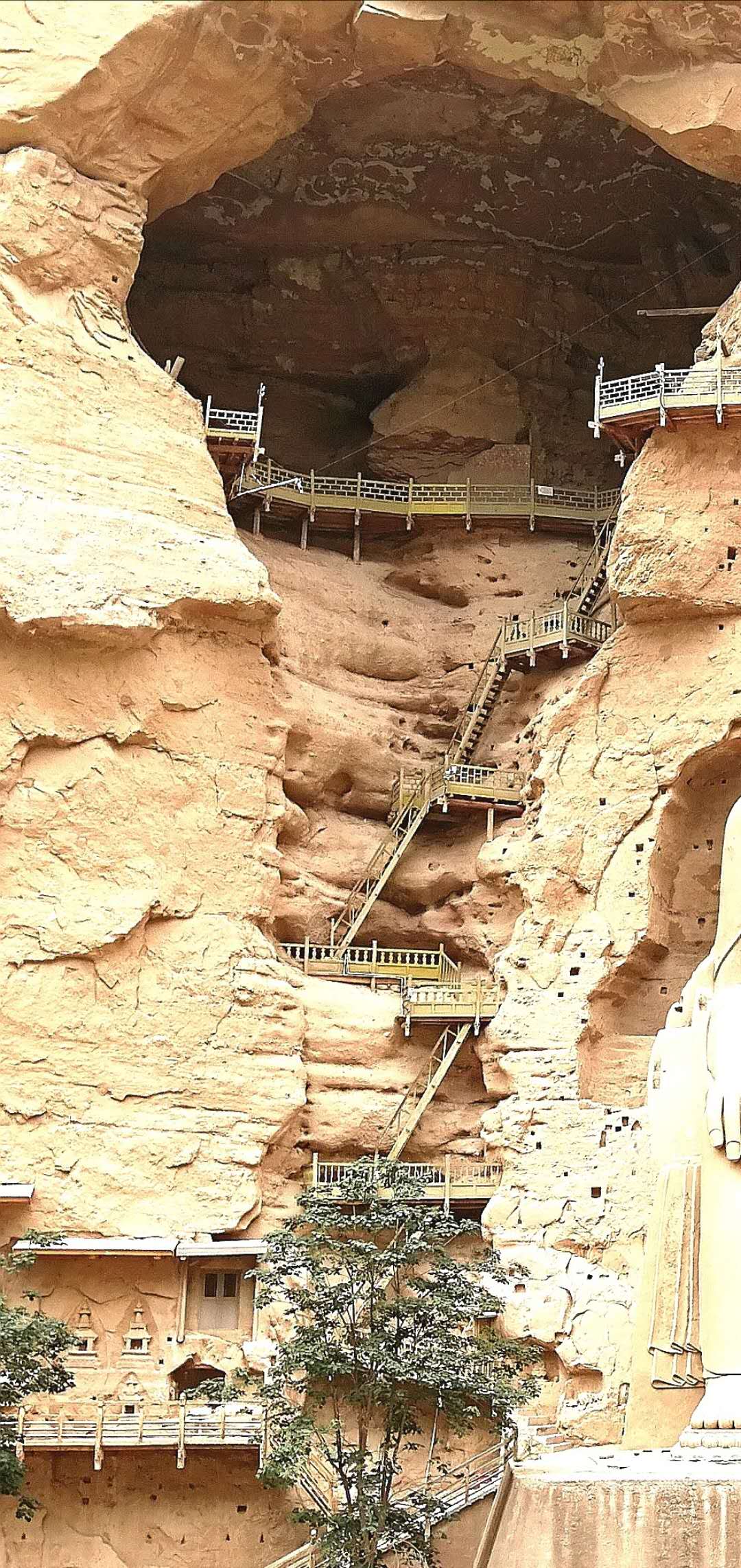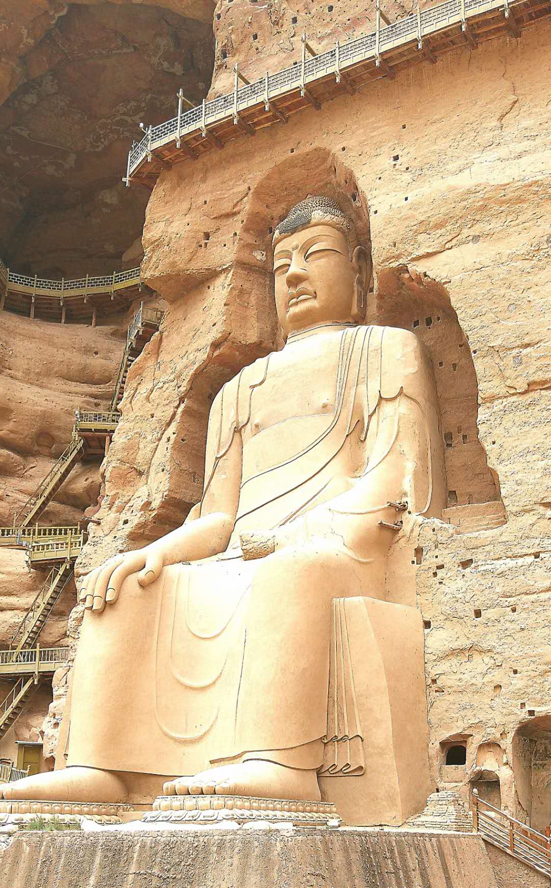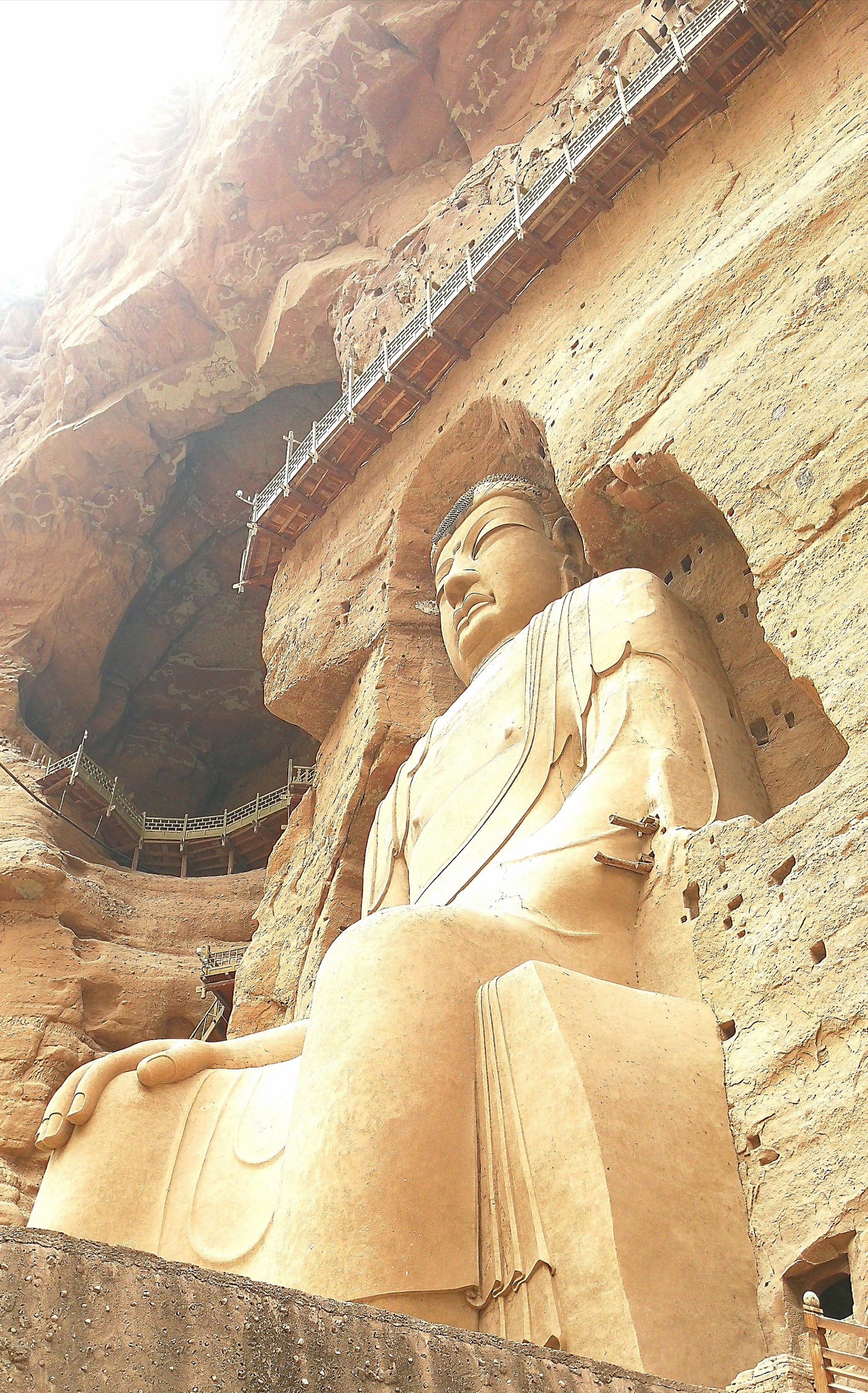 顺着栈道伸展的方向望去,高高的崖壁上,赫然一座巨大的佛像闪入眼帘。没想到这绝壁悬崖之上,竟有这样的大石窟,竟有这么大的石胎泥塑弥勒佛大坐像。