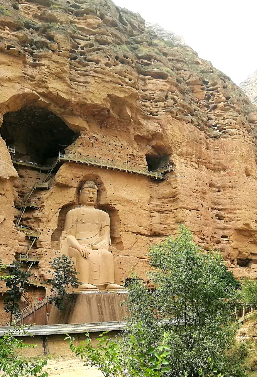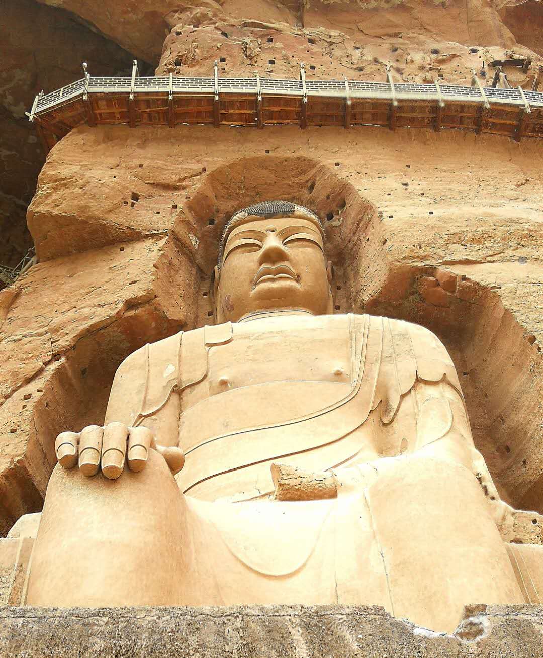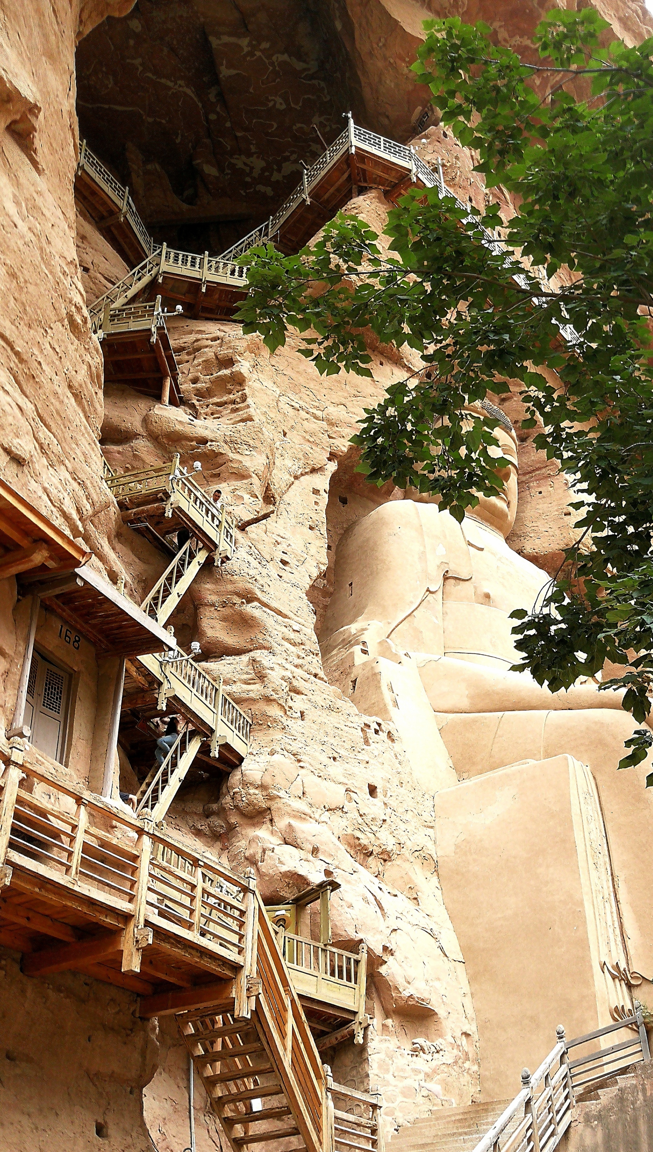 顺着栈道伸展的方向望去,高高的崖壁上,赫然一座巨大的佛像闪入眼帘。没想到这绝壁悬崖之上,竟有这样的大石窟,竟有这么大的石胎泥塑弥勒佛大坐像。