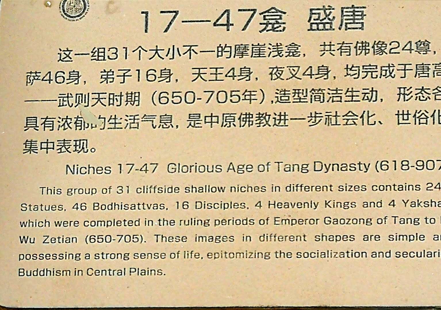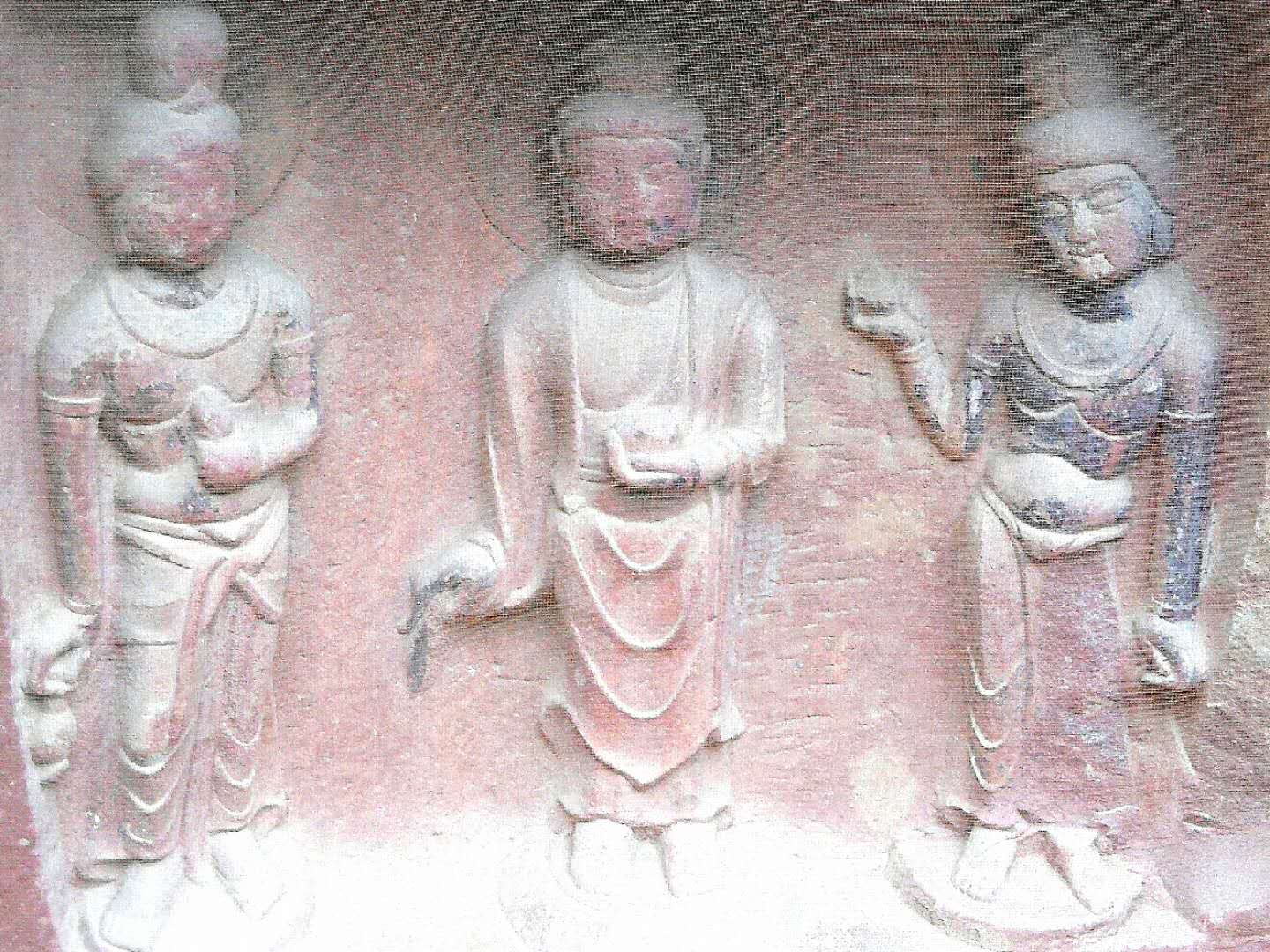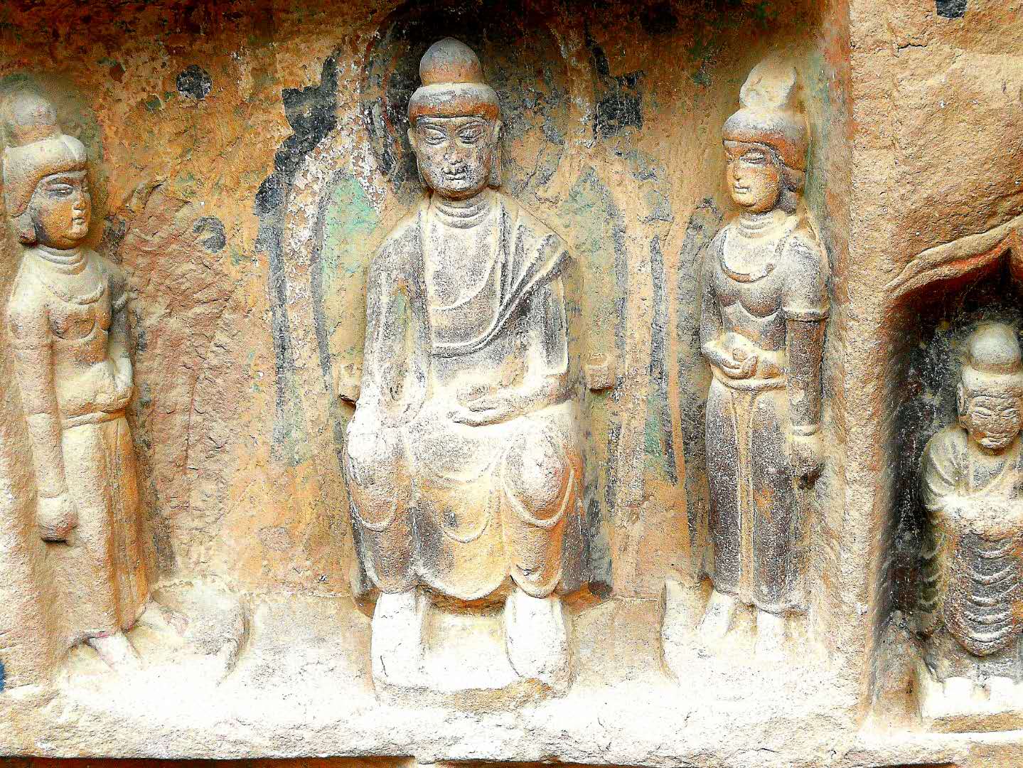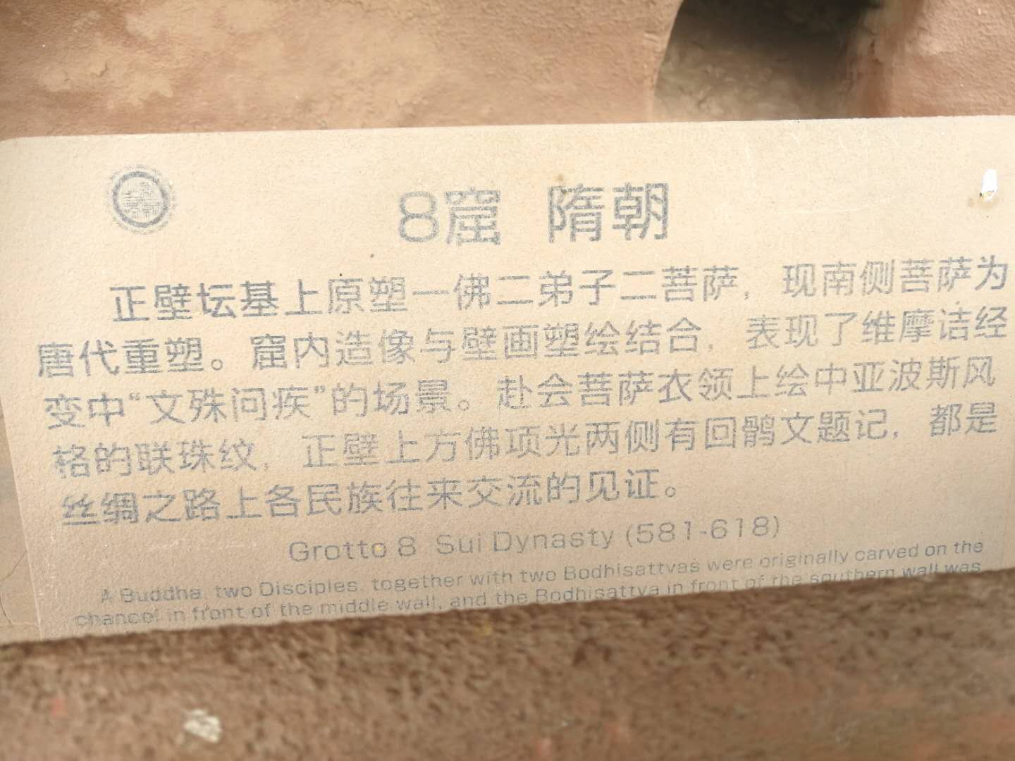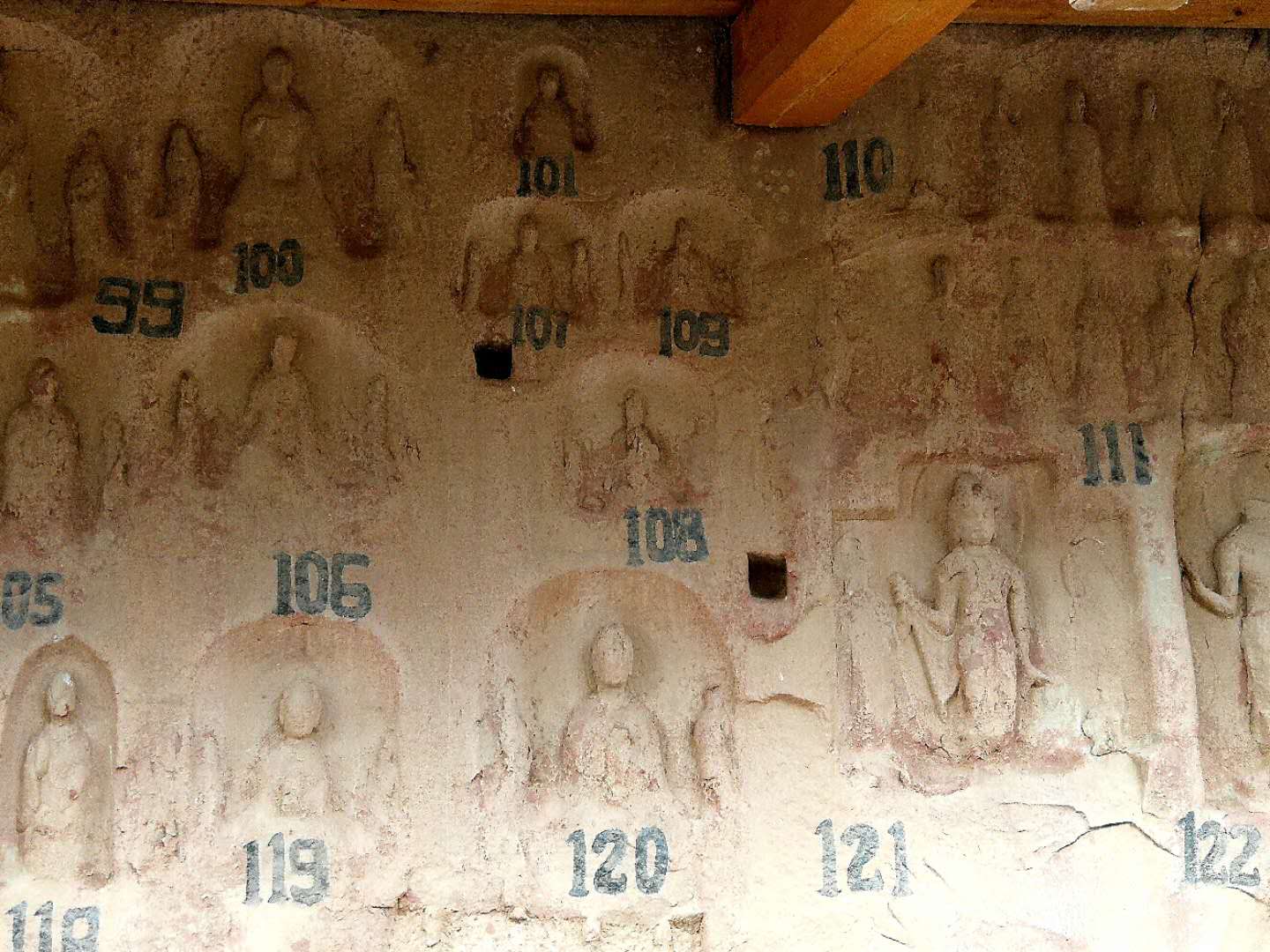 看到了,那石窟中的佛像。一般都是高浮雕,也有些是全雕塑。由于近在咫尺,人物神态、服饰变化、周围物景衬托,都清晰可辨。