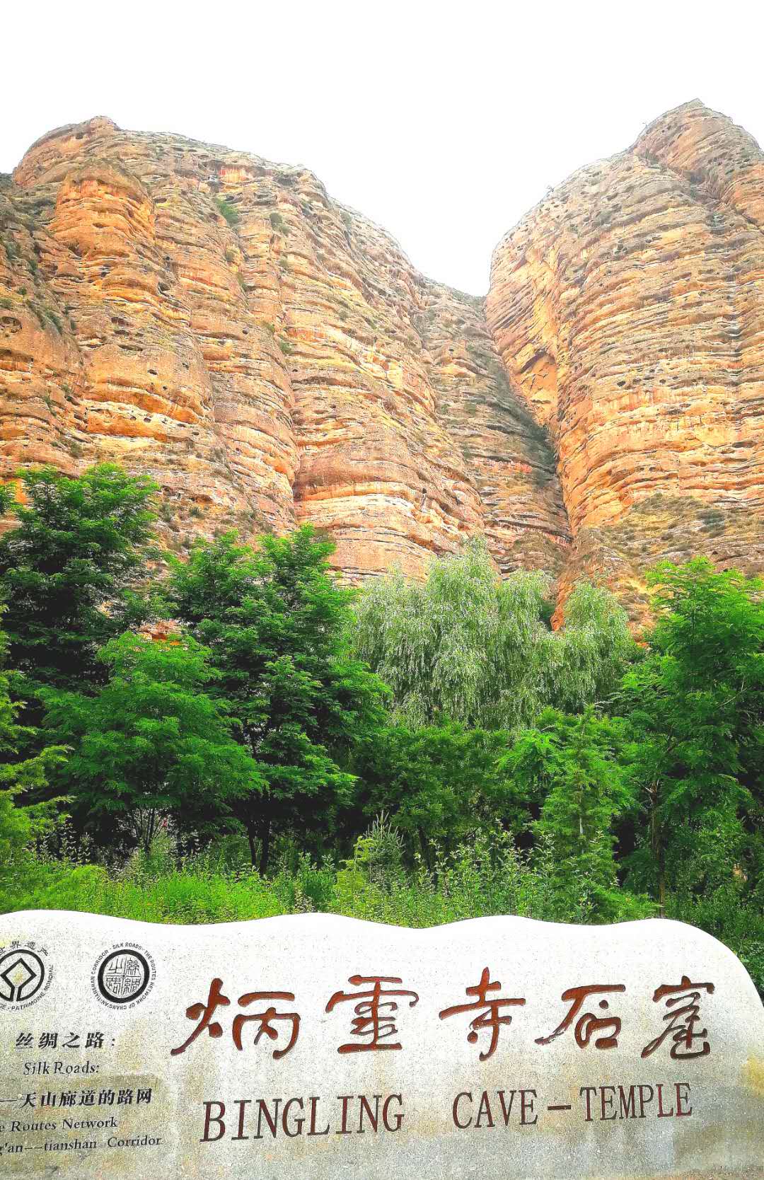 道路左边就是甘肃省著名的积石山了。积石山南北宽约33公里,东西长约37公里,总面积910平方公里。我们看到,一块长条巨石上刻:炳灵寺石窟。丝绸之路”长安-天山廊道的路网”的一处遗址景点。