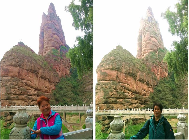 突兀山峰下的景区门口前,高兴的战友们,再次合影纪念这个时刻。