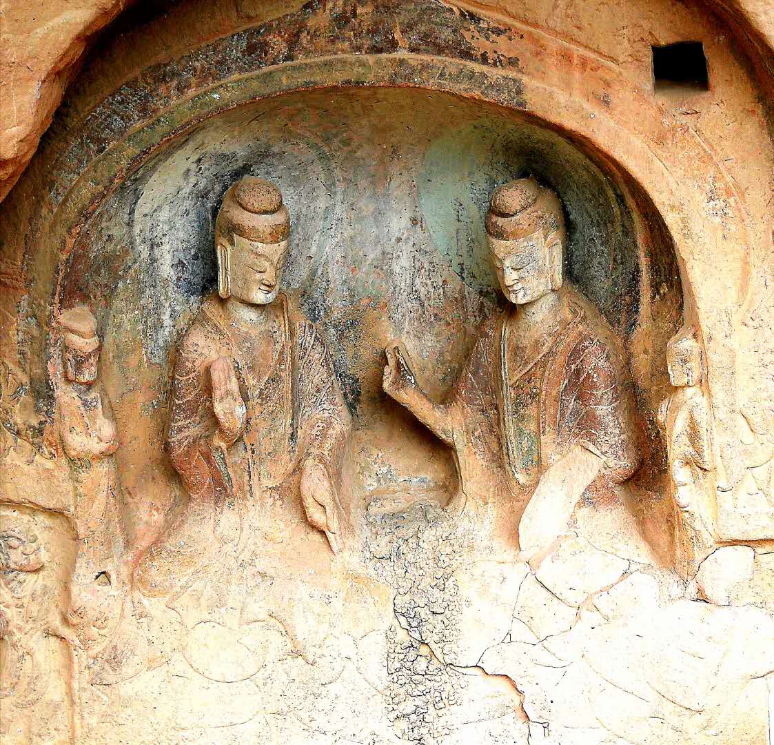 看这孔石窟里,中间佛似在讲法,两侧站立者肃穆,再外似两弟子抚琴,窟门口两站立者挽衣待伺。场面生动,也很生活。