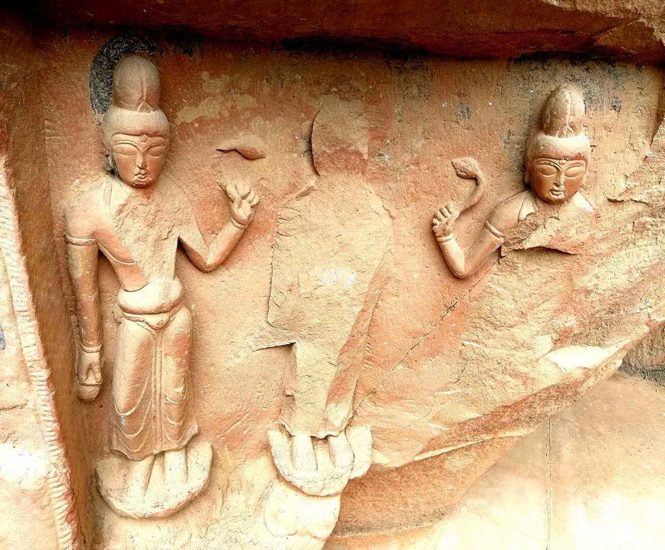 看到这一切,使人想起范文澜在他的《中国通史》中所说,炳灵寺石窟不仅以石刻雕像作品见长,其浮雕佛塔和密宗壁画同样与莫高窟和麦积山石窟齐名。炳灵寺壁画真实地反映了十六国时代西北地区的社会风貌、音乐舞蹈以及装饰艺术,对佛教的认识和理解,具有十分重要的研究价值呀!