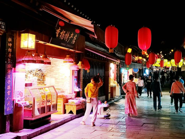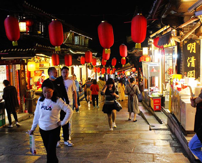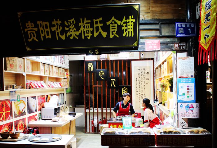 古街上,依然保留着古时的马道驿站,贵州及青岩的餐饮美食,当地的服饰、首饰,茶店、酒馆。无论白天还是夜晚,店铺经营热闹异常,游客不断。有外地的旅游者,也有当地人。这里最出名的是一种酱猪蹄,也叫“状元猪蹄”。凡来古镇者,极少不去品尝青岩古镇的“状元猪蹄”。
