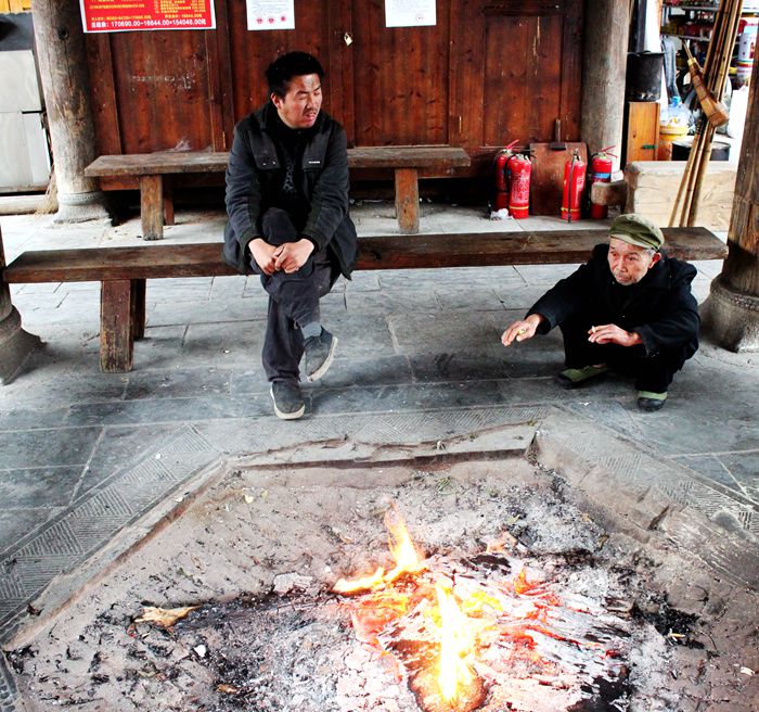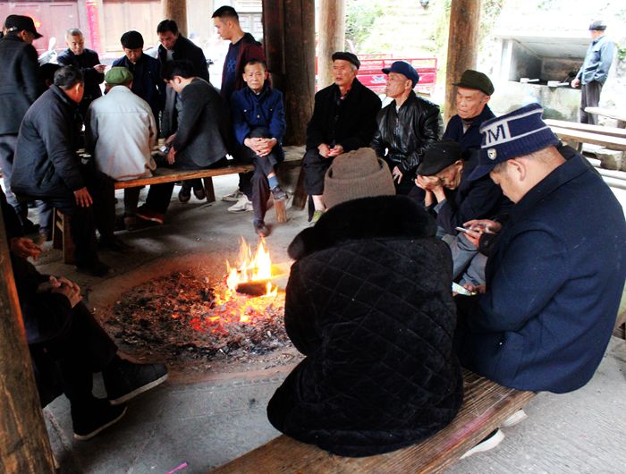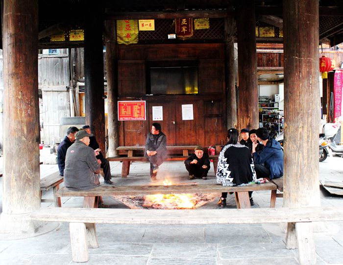 信团鼓楼的乡民在此取暖 谈天说地 鼓楼内侧四根大柱子