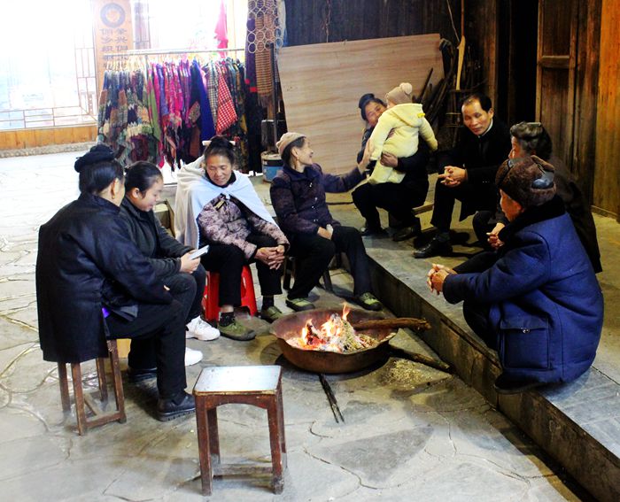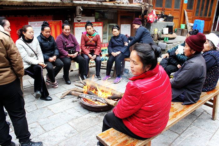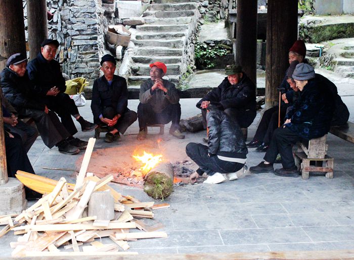 侗寨人喜欢女性聚在一起 天气凉爽 她们生火取暖