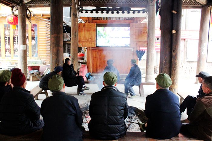 义团族人在鼓楼里取暖看电视 每座鼓楼都有政府配发的电视机