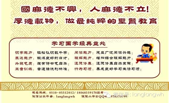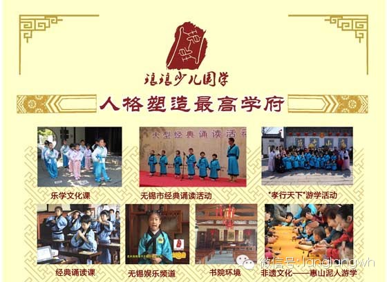 琅琅少儿国学--做最纯粹的圣贤教育,是立志专一从事少儿国学教育培训的专业机构,承载“为天地立心,为生民立命,为往圣继绝学,为万世开太平”的使命,历经5年的成长积淀,拥有丰富的国学少儿教学经验。琅琅以“快乐学国学”为教学理念,以极具人文气息的东林书院和荣巷古镇太伯书院为教学基地,以精品小班制个性化教学为特色,结合少儿身心特点,精心设计系统化课程,培育“幼而能言、识文断字、知书达理、动静有常”的快乐中国娃。http://mmbiz.qpic.cn/mmbiz/0r6TYTOEV0O1Pq35cj1cRBn010umwRpbToibrA4Spy1jSHQsPGw2xbNPAPDqHs7bG5SoKXVoM8nqQZW4k8I8ribw/0
