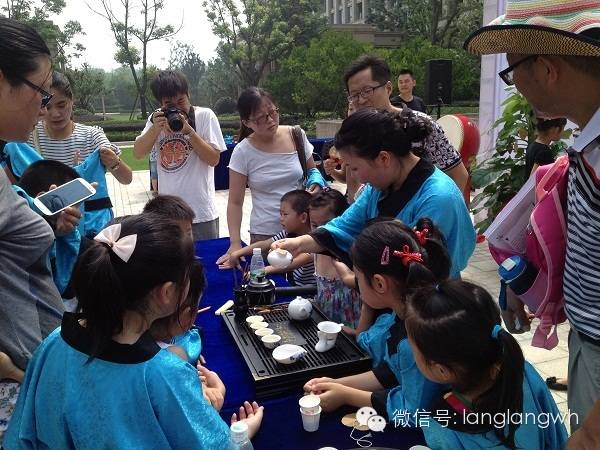 茶道表演。琅琅的鞠老师为家长和孩子们献上了精彩的茶道表演。小朋友和爸爸妈妈围在鞠老师身边,聚精会神地看着整个茶艺表演的过程,不时地还向鞠老师请教关于茶道的问题呢。