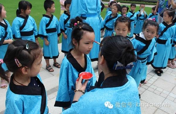 朱砂启智。古称“开天眼”,具有明目明心的功效。琅琅的老师们手持朱砂和毛笔,在小朋友的眉间轻轻一点,预示着小朋友从此开启学习之路。
