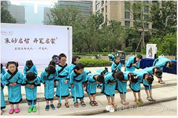 小朋友们在老师的指导下有秩序地站好,跟随老师念道:“鸟欲高飞先振翅,人求上进先读书!”调整衣冠,向长辈庄重地敬礼,感恩父母长辈的养育。