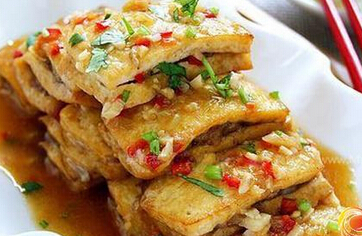 1.将豆腐切成1厘米厚的薄片,用盐水渍5分钟,沥干待用;