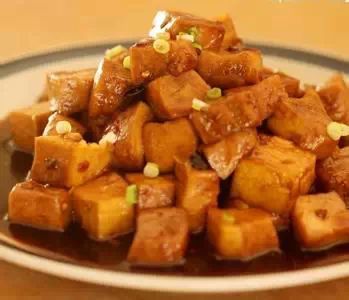 3.炒锅下油烧热,下豆腐丁炸至金黄沥油捞出。