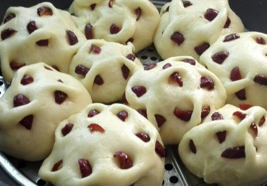 红枣切条,觉得造型麻烦可以把红枣条切碎包在馒头里面!