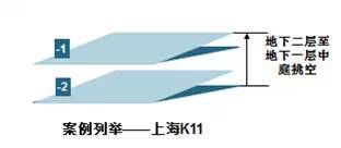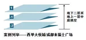 ② 地下空间中庭与挑空开敞是指地下空间中庭挑空设置应该相对灵活,可以采用一层至地下二层挑空、局部挑空,增强项目立体空间一体化;也可采用多种中庭挑空形式融合,如成都来福士广场、西单大悦城、北京爱情海购物中心;或者下沉空间挑空预留,如南京水游城/成都IFS/北京芳草地。