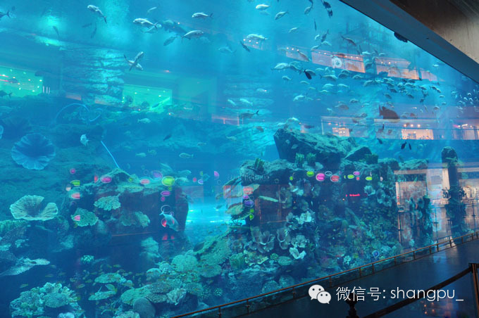 1、购物中心最大水族馆。高达三层楼的水族馆,养有包括虎鲨和鳐在内超过33000多头水生动物。
