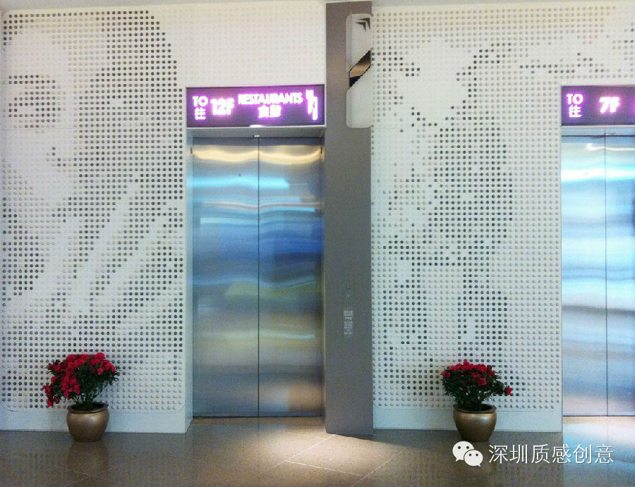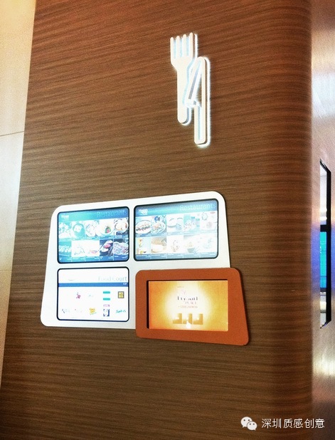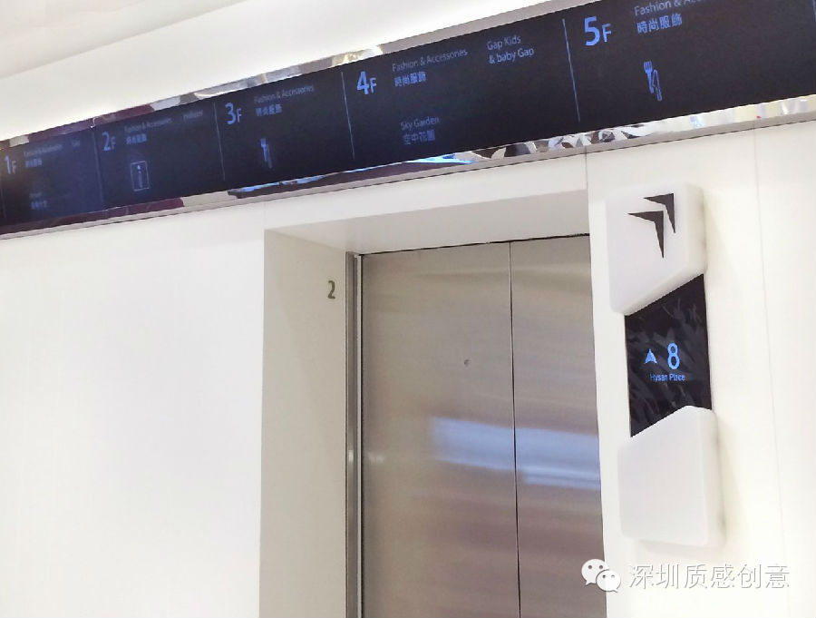 电梯口的信息指引牌,通过对每层的商业业态进行分类,用低成本的材质带来高品质的感官体验。