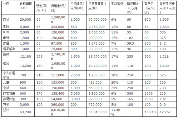 这里选取一个沿海二级城市B购物中心作为案例。该项目商业总建筑面积10万平方米,计租面积63,280平方米,周边3公里没有同类竞争项目,通过商情调查,其购物中心可以实现的零售销售预期为: