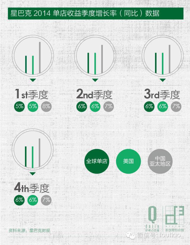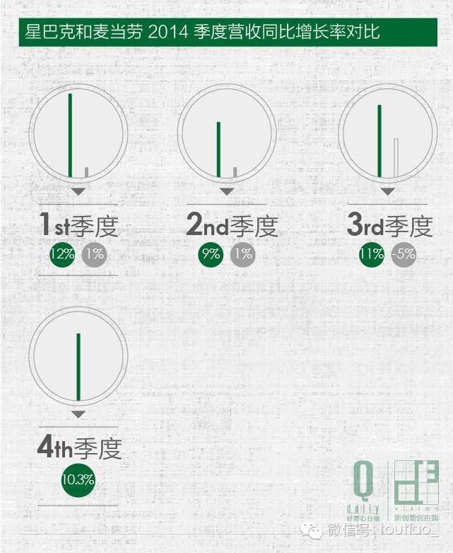 根据星巴克2014年度财务报告,它四个季度的营收同比增长率都稳定在10%上下。这样稳定的增长已经维持了将近三年,而在星巴克增长最快时期的速度甚至超过了麦当劳,资本市场对它寄望甚高。