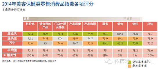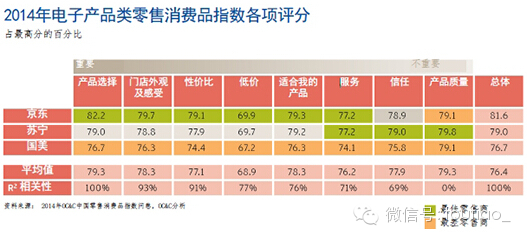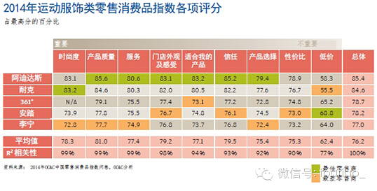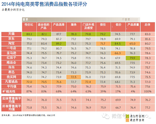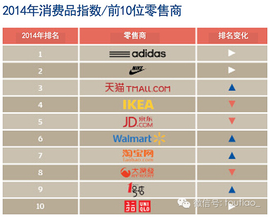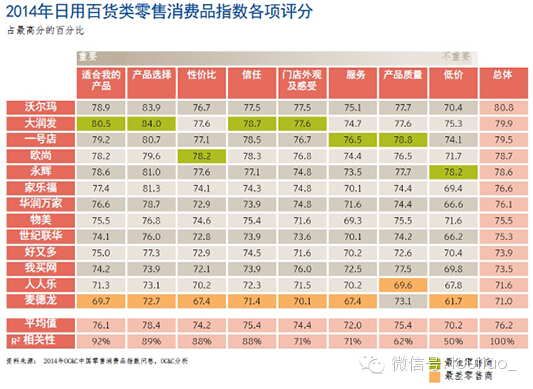 2014年OC&C中国零售消费品指数在全国范围内调研了两千多位消费者,让他们选出自己最喜爱的零售品牌,并校对整理了针对5个零售种类(运动服饰、日用百货、服饰、纯电商及电子产品零售商),以及53个商家的两万多份消费者评分。