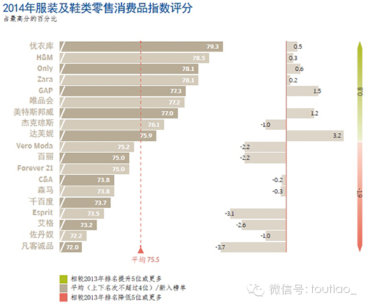 在服装品类上,优衣库同去年一样排名第一,并同竞争者们进一步拉开差距。总体而言,这一品类的两极分化正在加剧,赢家和输家的评分差距越来越大。
