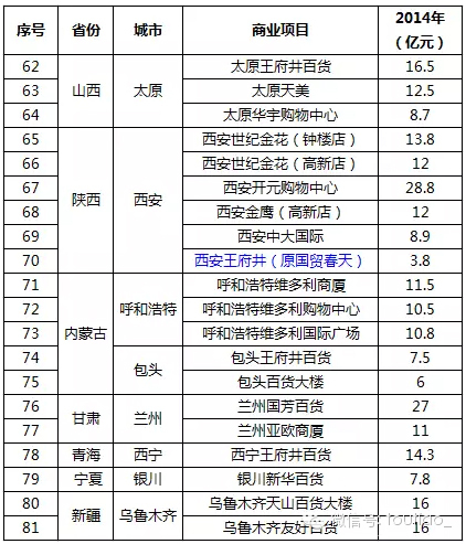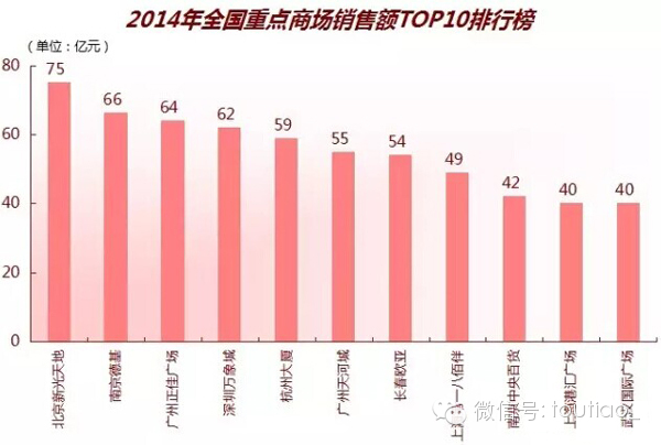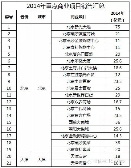 2015年已经悄然到来,近期网络上流传着几张全国商场业绩的报表(2014年中国百货、购物中心单店销售排行榜),大多数据来自联商网和业内知名组织“零售男人圈”,虽然圈内人对某些商场的数据准确性看法不一,但大部分还是有参考价值的。由于统计口径不同,该数据仅供业内人士参考。
