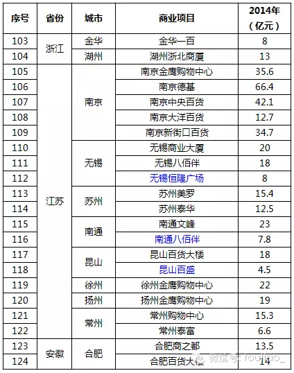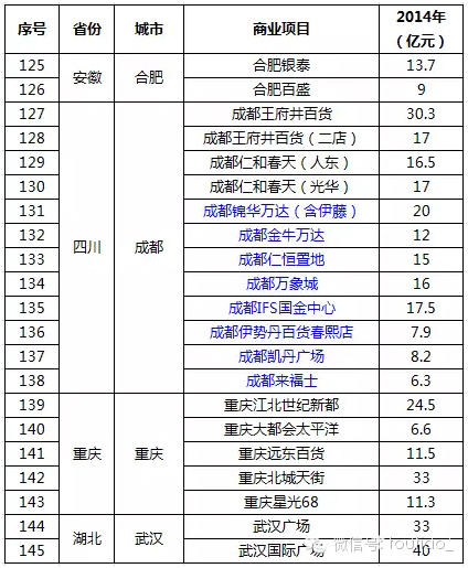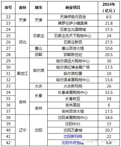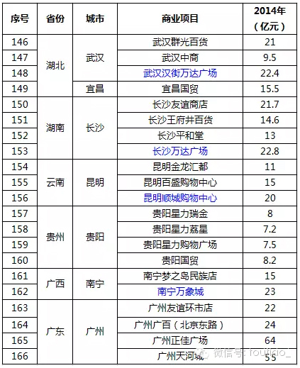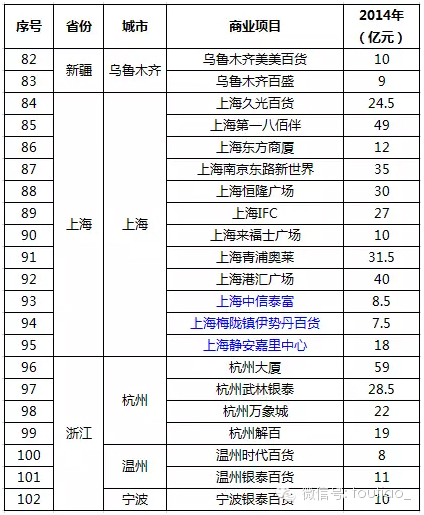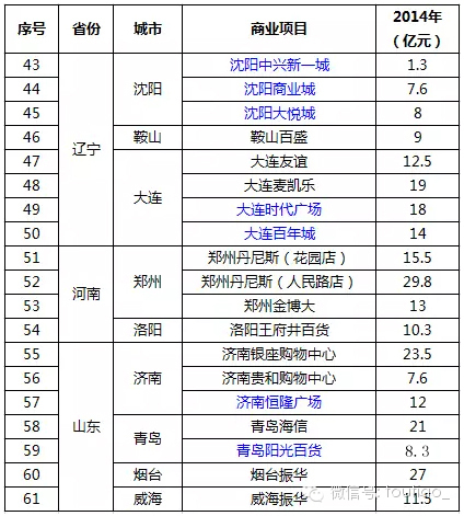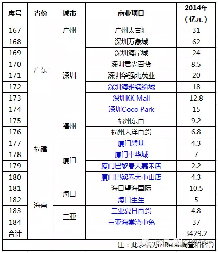 下图附表:一部分的数据来自于iziRetail进行的行业调查,另外一部分的数据来自于业内组织“零售男人圈”发布的信息。(蓝色字体为在原表基础上新增的商场)