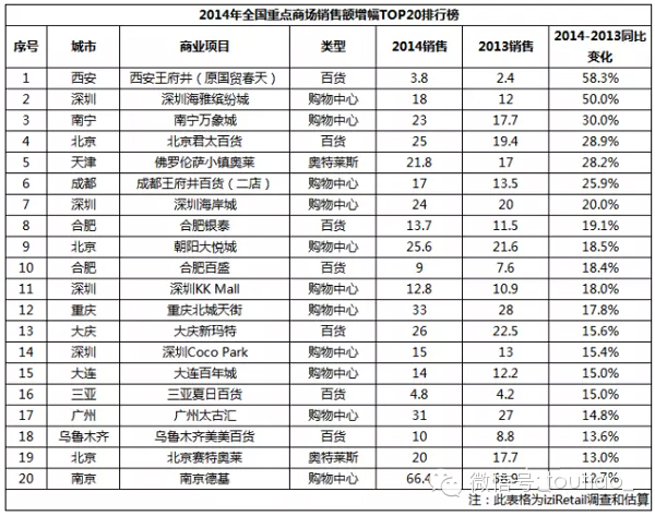 以下是2014年增幅前20名的商场,值得说明的是,一些增幅较大的商场,可能是因为前年的基数不高,另外一些则是因为经营策略稳健而带来的收益。