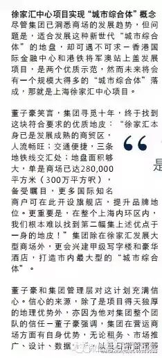郭炳江:徐家汇处于三条地铁线交汇的黄金地段,如香港的铜锣湾,项目投资额约400亿港元,是新地(新鸿基)历来最大投资,上盖物业连地下的可营业面积约70万平方米,折算每平方米地价3.09万元人民币,预计项目中约有42万平方米楼面面积用作投资物业用途,28万平方米楼面套现200亿港元。