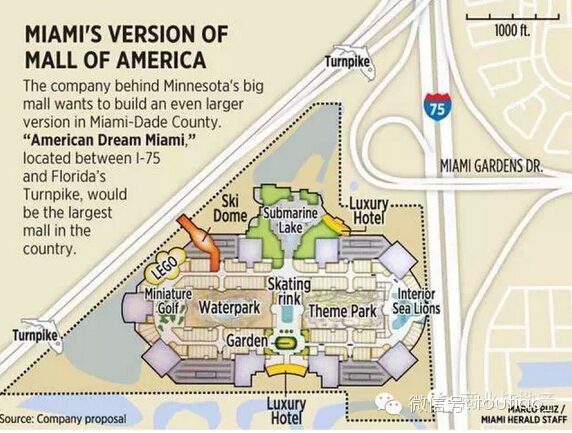 近日,美国拥有并运营着美国最大的购物中心(Mall of America)的公司计划在迈阿密开设一个更大的购物中心。这个计划中的购物中心将大约占地200英亩,并包含有一个主题公园。建成后,将成为美国最大的购物中心,命名为American Dream Miami。