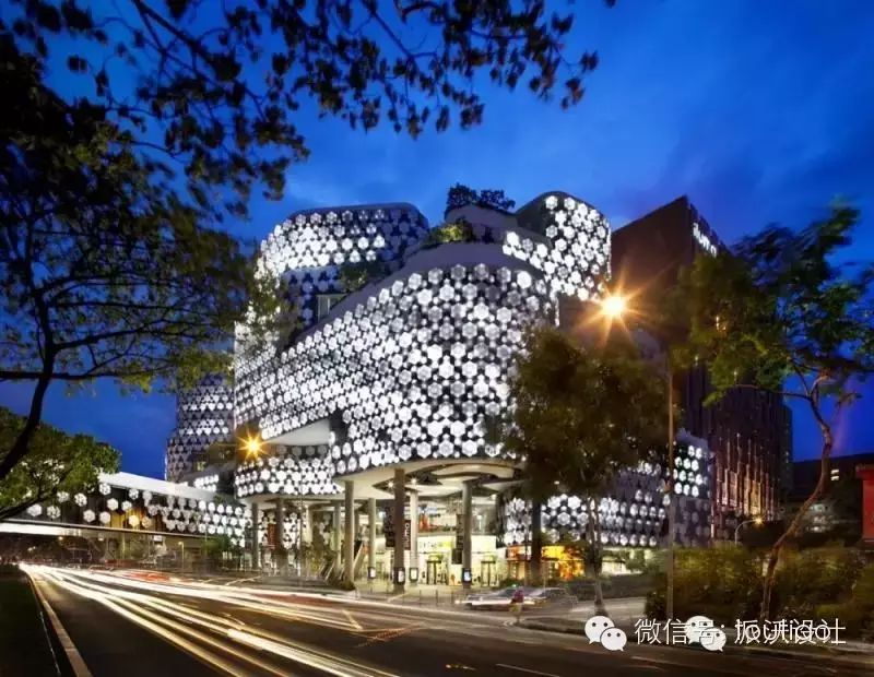 新加坡Iluma购物中心外立面是极具艺术感的水晶网外墙立面,是由小面的像宝石似的物体组成,在白天闪闪发光,到了晚上则发出绚丽夺目的色彩。