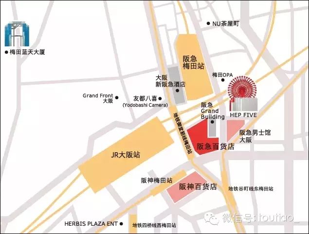 日本大阪梅田铁路车站位于大阪市的梅田区。梅田一带俗称“北区”,是西日本最大的繁华街区。日本国家铁路公司JR线,阪急公司阪急线和阪神公司的阪神线都汇集在梅田车站。三家铁路公司和城市地铁公司的八条轨道交通线可分别通往京都、神户、关西国际机场、宝冢等地区。由大阪市梅田站乘JR线到新大阪站可以换乘新干线到达日本各地。这样的地理位置当然给了阪急阪神百货店一个很大的客户支撑。