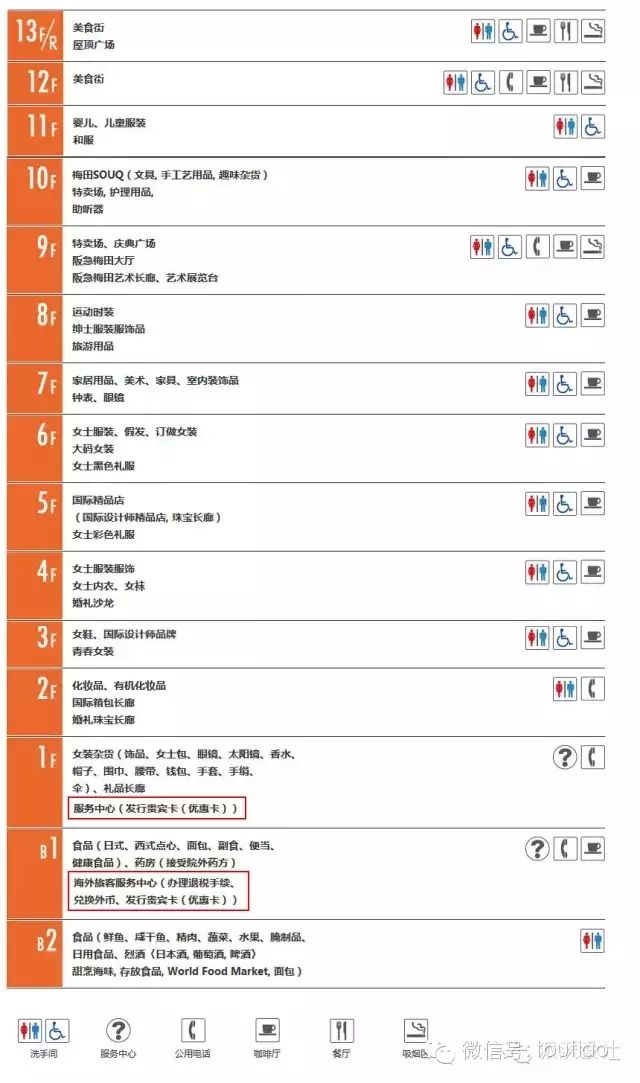 1、1-6层位女士用品,重点增加16至20岁左右青春时尚用品;2至5层汇集知名国际品牌合计150个,面积超过1万㎡,为世界之最;4层目标客群为25岁左右的白领,增加设计师个性化品牌;7、8层为男性用品;11层是儿童服装、杂品以及职业体验区;B1—F11都有咖啡、红茶等休闲饮食,合计14个店,800个席位,13层为餐饮街,直通外边大型露天平台。