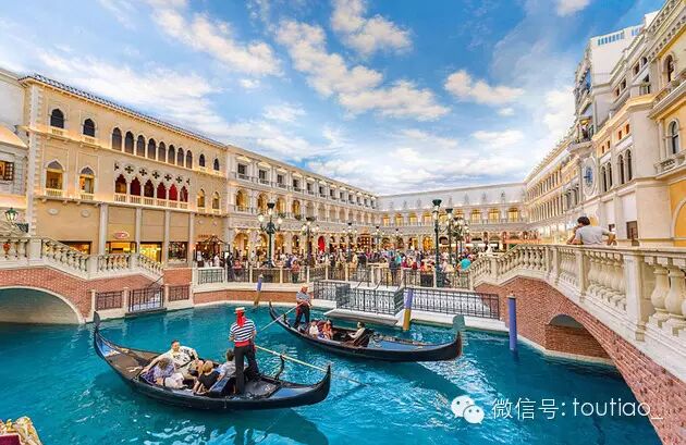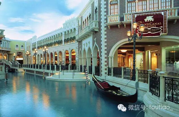 在美国拉斯维加斯的威尼斯人酒店,顾客可乘坐狭长的贡多拉小船(gondola)在酒店内购物。