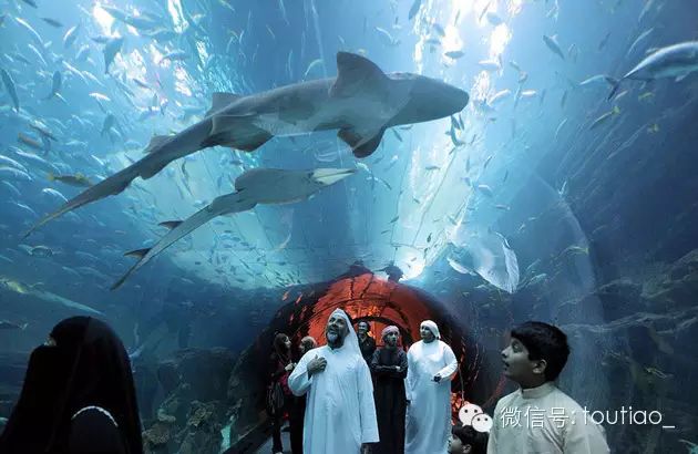 在阿联酋购物中心里有令人印象深刻的水族馆隧道,游客可以在这里看到鲨鱼。