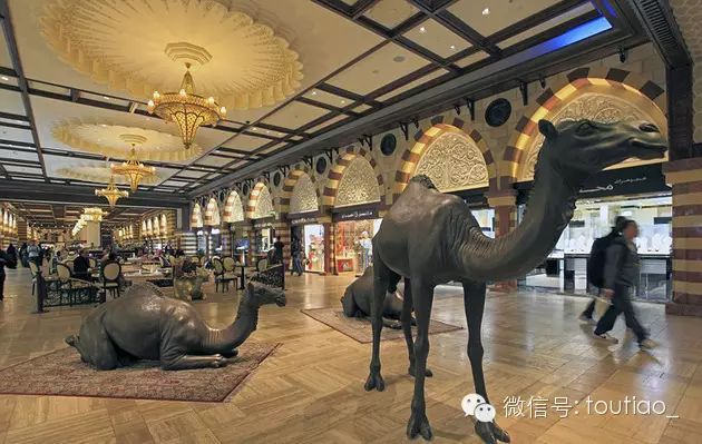 华丽的阿联酋购物中心内的骆驼雕像、黄金吊灯以及无数豪华珠宝零售店。