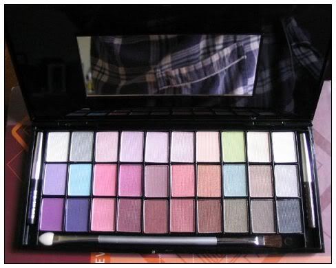 打开,里面有30个眼影,两只眼线笔,双头applicator,还有面镜子,像模像样的呢。