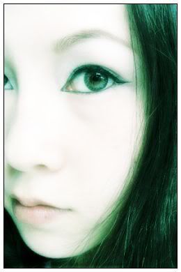 最后来一张整体效果。因为没有打底妆,所以把图片弄绿了,是不是很妖怪?我今天化完,马上低着头狂奔进卫生间卸妆了,这样的浓眼妆在一张素面上真的是相当惊人的,而且眼神很凌厉,整个变成了凶巴巴的悍妇风格。