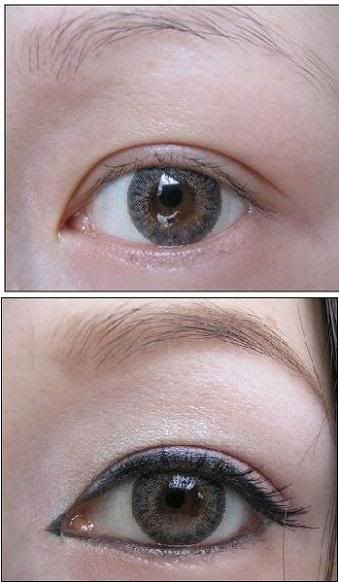 加入了假眼头和拉长眼尾之后,眼睛的形状确实被改变了,由圆眼变成了两头尖尖的长眼,化妆真是有意思啊。看看裸眼和妆后的对比。