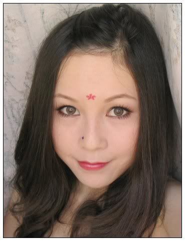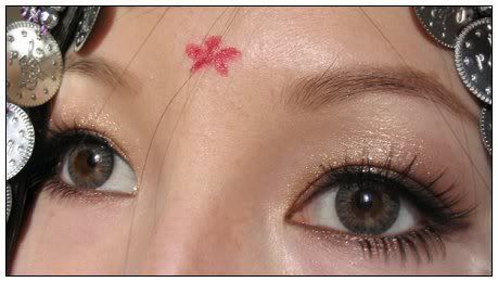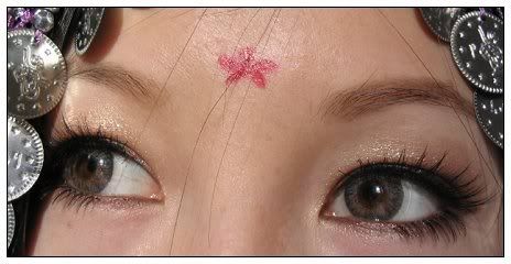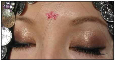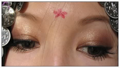 眉心点红点,眼影再加重些,这会儿大太阳出来了,拍出来的眼妆光泽超美超写实