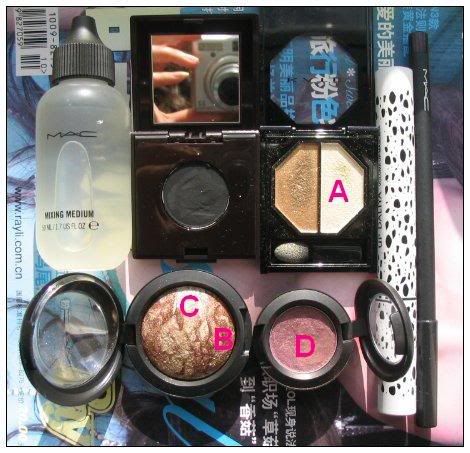 kate盘浅金色A眼皮打底并打亮眉骨,刷子2取MAC by jupiter中深色脉络B化眼窝,奶油金脉络C晕开边界,再用刷子3取B加重眼尾。刷子1沾取LM眼线粉化内眼线。碳晶笔化外眼线。
